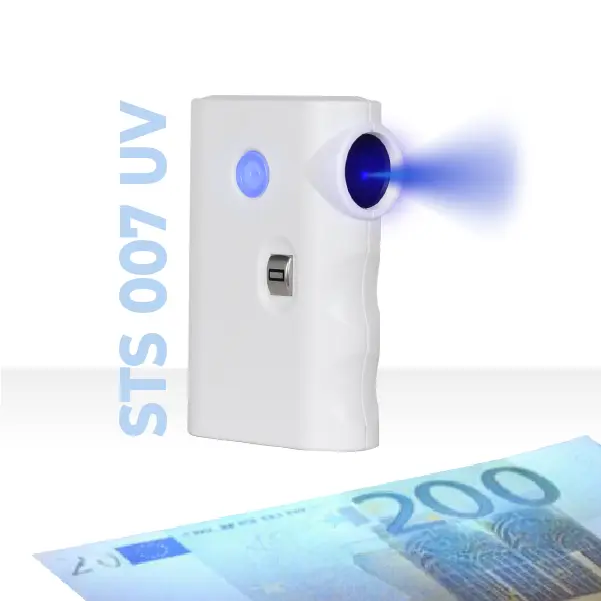Компактният детектор STS 007 позволява лесно и удобно разпознаване на фалшиви банкноти чрез UV проверка. Благодарение на малкия си размер и мобилния дизайн той е подходящ както за работа на каса, така и за използване в движение.