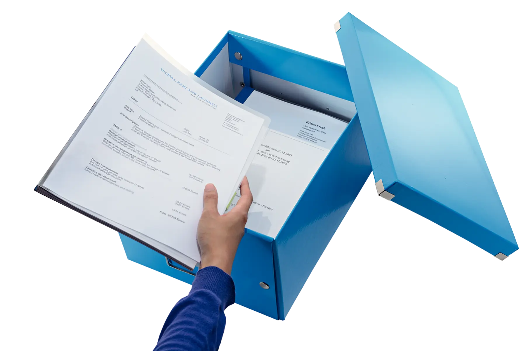 Кутията Leitz Click & Store синя е удобна за употреба в офиса и дома, като има ламинирана повърхност за дълготрайна защита и метални ъгли на капака, които я предпазват от прегъване.