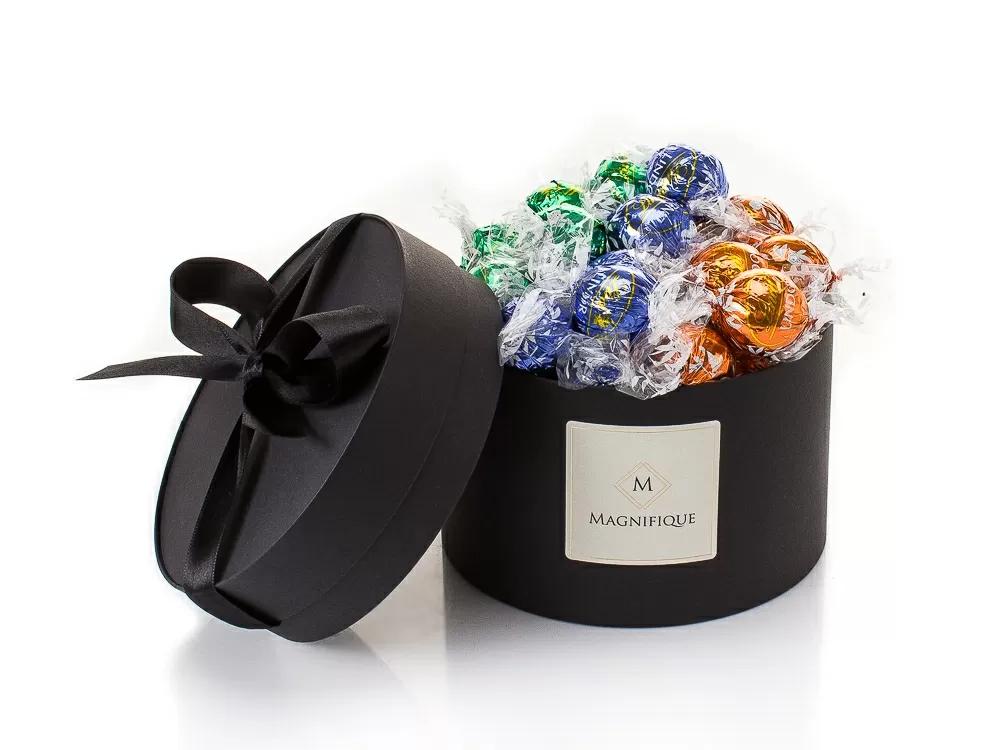 Подаръчната кутия е луксозна цилиндрична подаръчна кутия със сатенена панделка и микс от бонбони Lindor.