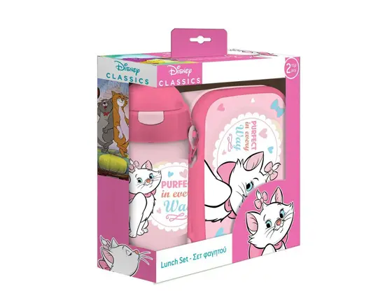 Кутия за храна и бутилка за вода Marie cat с красив дизайн, вдъхновен от популярното коте на Disney, комплектът е идеален за малки дами, които обичат сладки детайли и практични решения. Подходящ за училище или разходка.