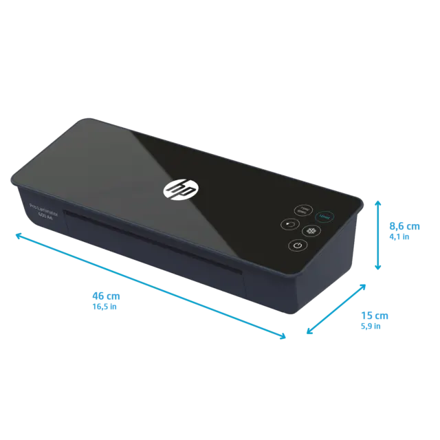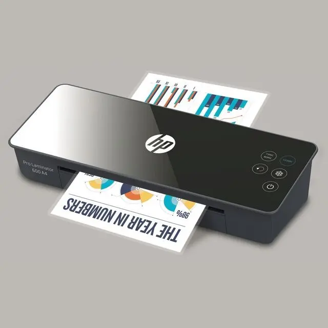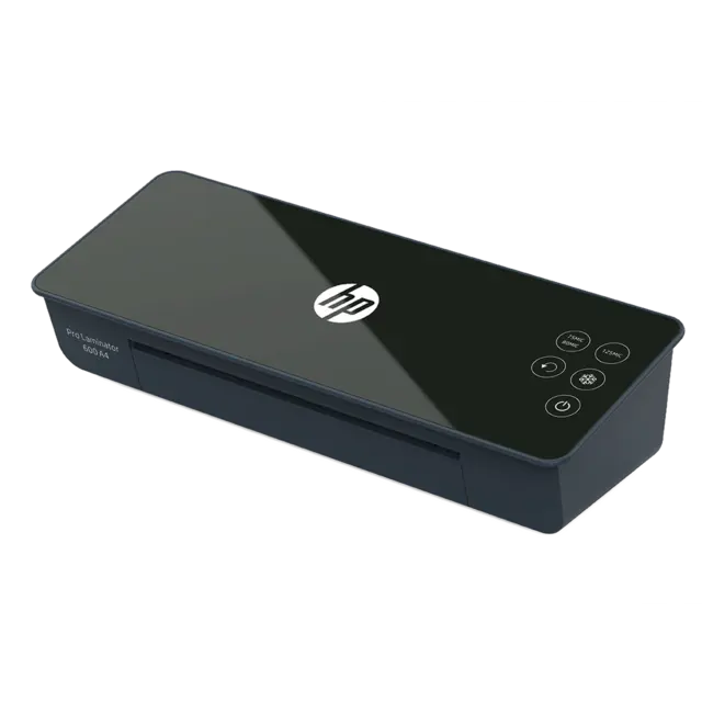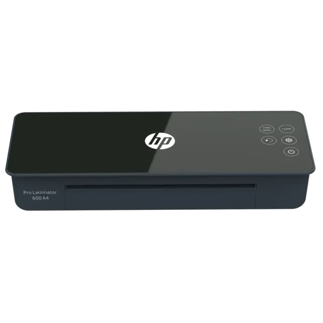 Ламинатор HP Pro 600 A4 е мощен ламинатор с висококачествена гланцирана повърхност, който се вписва перфектно във всеки офис или работно пространство. С време за загряване от само 60 секунди, устройството е готово за работа почти веднага и ламинира със скорост до 600 мм/мин, което означава по-малко от 30 секунди за лист А4. Интуитивният сензорен панел позволява лесно включване и избор на подходяща температура според дебелината на фолиото. При евентуално засядане е наличен бутон за обратно движение, чрез който фолиото се освобождава бързо и безопасно. Ламинаторът поддържа както горещо, така и студено ламиниране за формати от визитна картичка до A4. Подходящ е за фолио с дебелина от 75/80 до 125 микрона и максимална дебелина на документа до 0,5 мм.