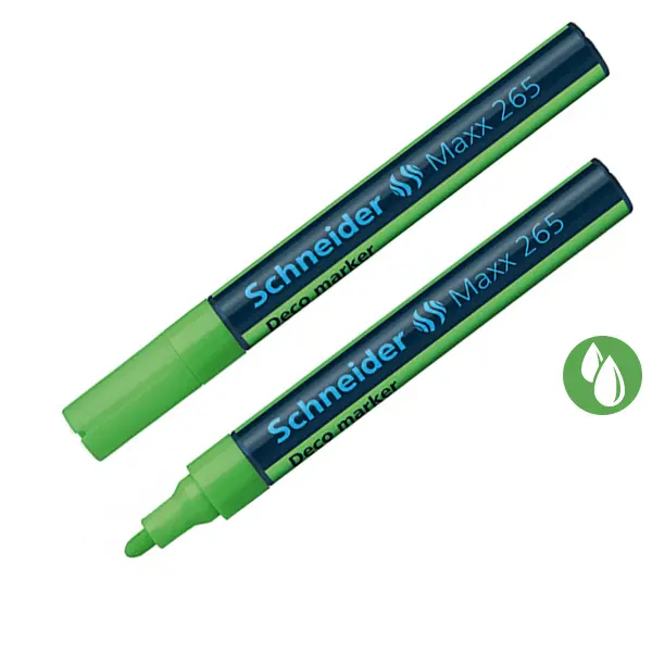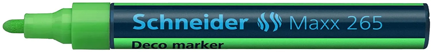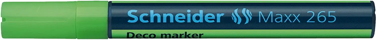 Маркерът тебешир Schneider Maxx 265 светлозелен е подходящ за надписване и декориране на прозорци и други затворени повърхности. Изключително лесно се почиства от гладки повърхности само с помощта на влажна кърпа. В същото време не се изтрива от грапави и абсорбиращи повърхности.