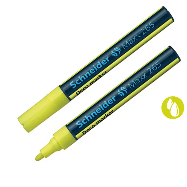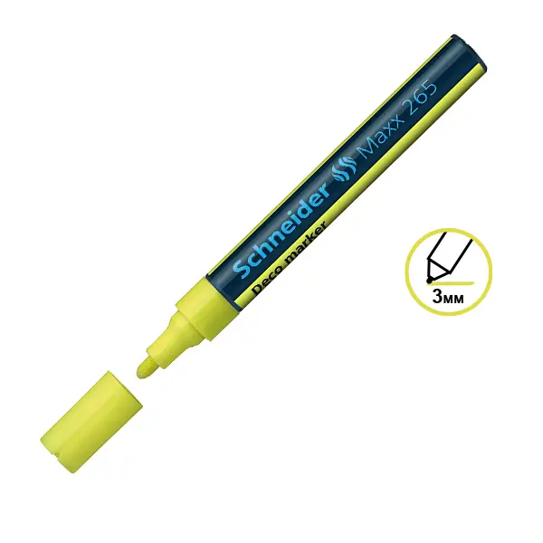 Маркерът тебешир Schneider Maxx 265 жълт е подходящ за надписване и декориране на прозорци и други затворени повърхности. Изключително лесно се почиства от гладки повърхности само с помощта на влажна кърпа. В същото време не се изтрива от грапави и абсорбиращи повърхности.