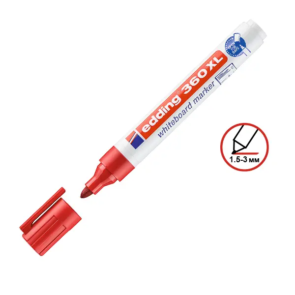 Маркерът за бяла дъска Edding E-360XL червен е подходящо за писане върху бяла дъска, стъкло, керамика и други. Може да се презарежда с помощта на мастилото Edding ВТ30.
