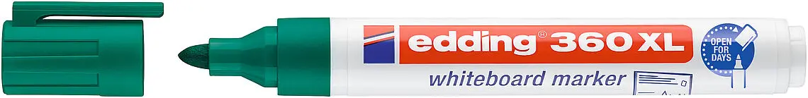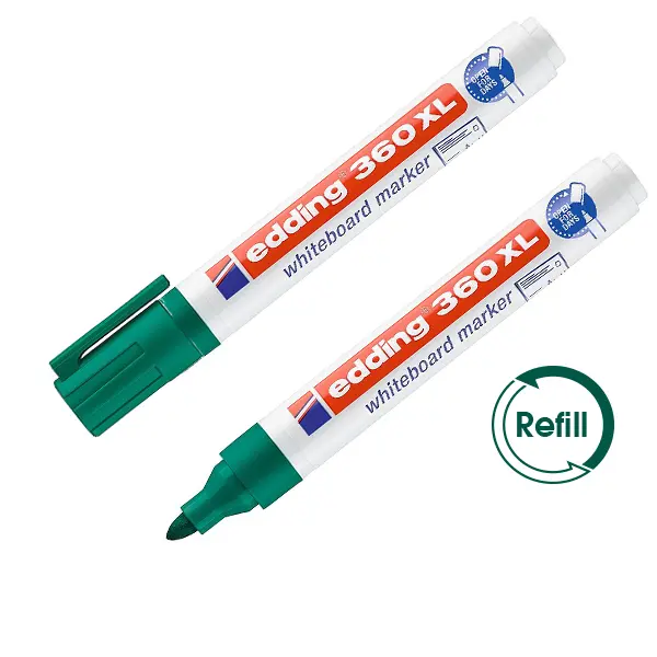 Маркерът за бяла дъска Edding E-360XL зелен е подходящо за писане върху бяла дъска, стъкло, керамика и други. Може да се презарежда с помощта на мастилото Edding ВТ30.