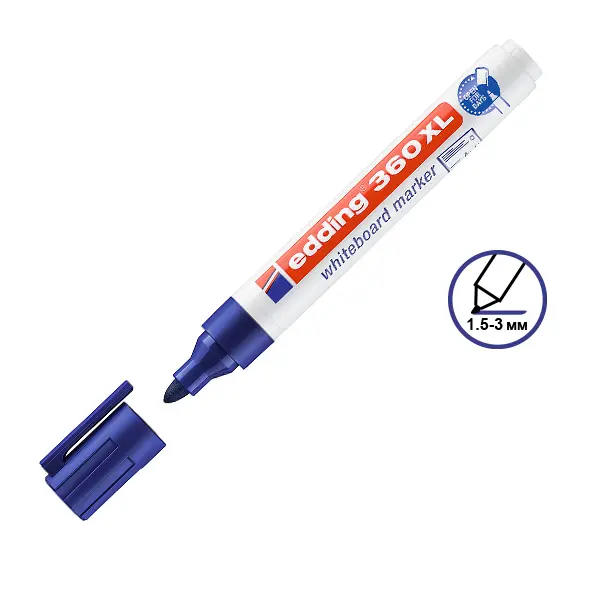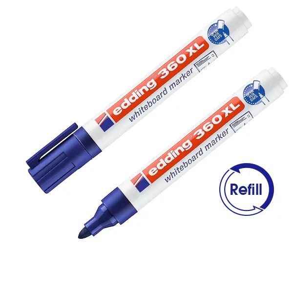 Маркерът за бяла дъска Edding E-360XL син е подходящо за писане върху бяла дъска, стъкло, керамика и други. Може да се презарежда с помощта на мастилото Edding ВТ30.