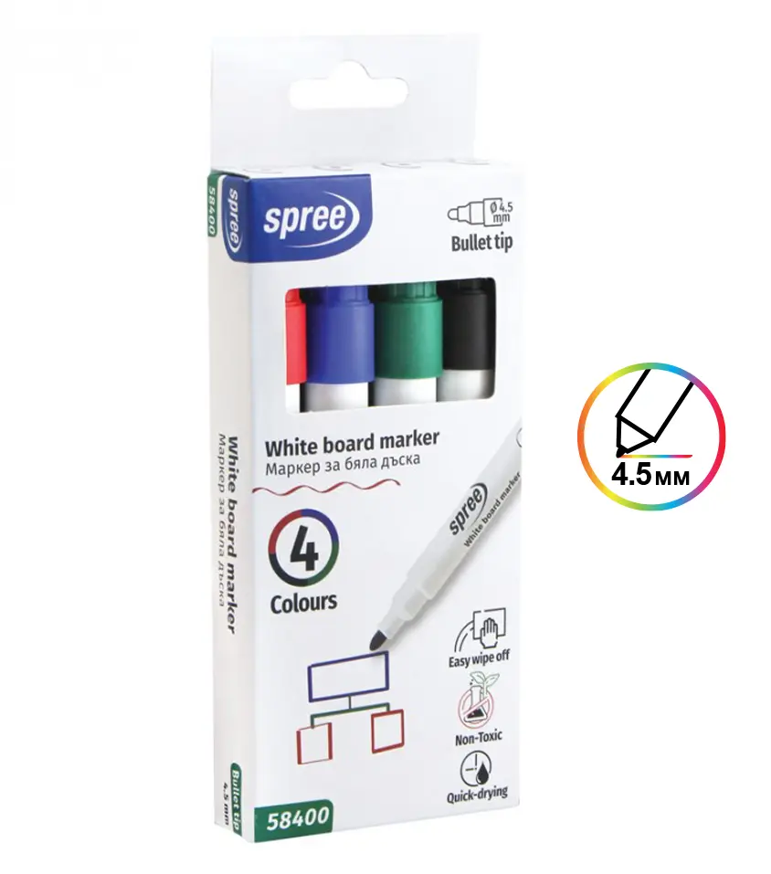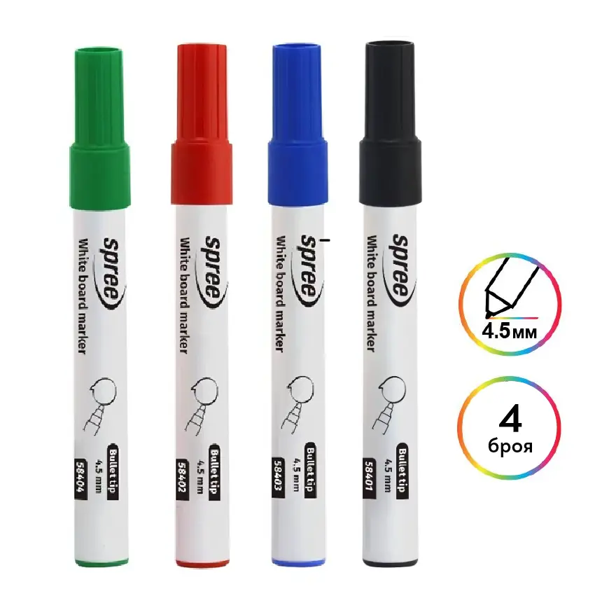 Маркерът за бяла дъска Spree е подходящ за употреба за бели дъски и флипчарти. Почиства се с лекота от бели дъски с помощта на суха гъба.
