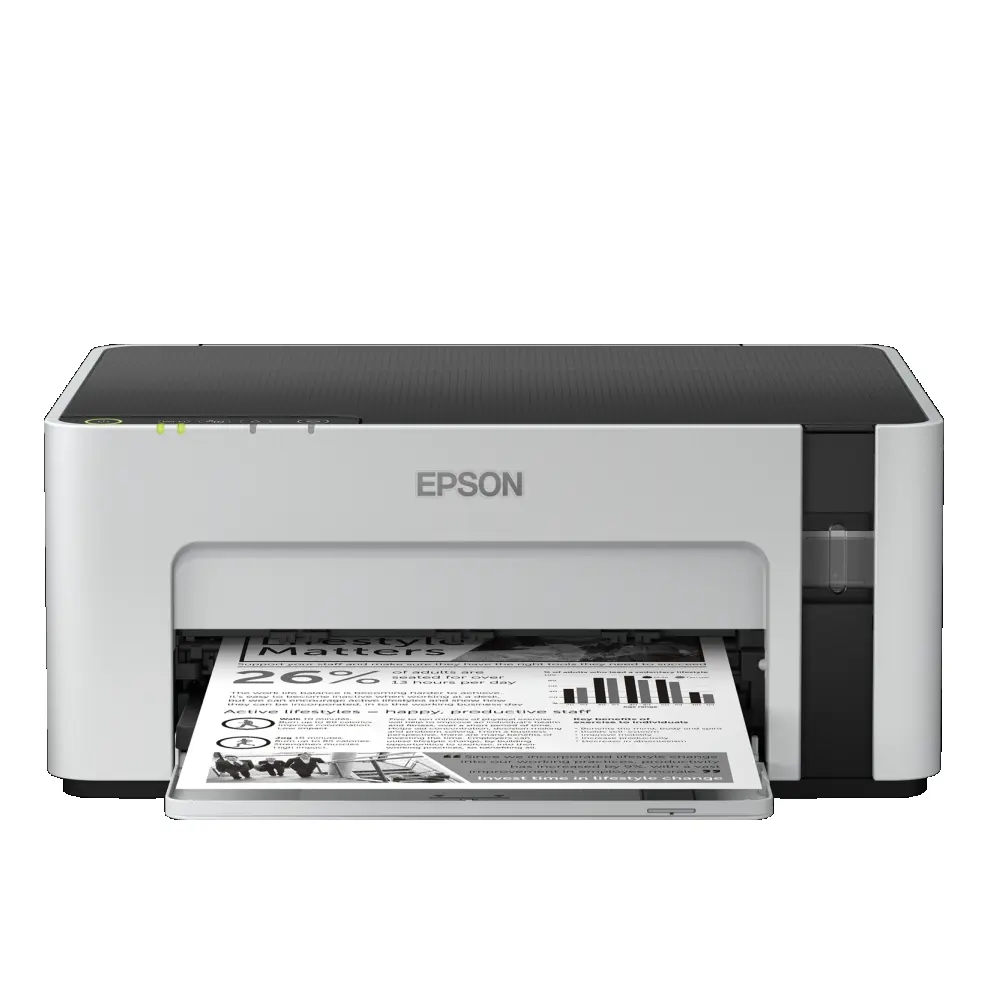 Epson EcoTank M1120 ви осигурява печат на ниска цена, висока надеждност, възможности за свързване чрез Wi-Fi и надеждна система за принтиране с резервоар за мастило. Високата производителност на мастилото и ниският разход на енергия ви гарантират ниски разходи при работа. Включеното към него мастило стига за принтиране на до 5 000 страници, което ви осигурява икономичност и безпроблемна работа. Тъй като резервоарът за мастило се намира в предната част на принтера, новият дизайн е компактен и ви предлага лесен достъп за допълване и ясен изглед за нивата на мастило. Високата скорост на отпечатване на първа страница от режим на покой и скоростта на печат от 15 стр./мин ви гарантират ефикасен работен процес. Мастиленоструйната технология не изисква топлина при принтиране, като по този начин нивата на разход на енергия са ниски, а вашата сметка за ток – малка. Възможността за свързване с Wi-Fi и USB ви гарантират висока продуктивност и ефективна работа.