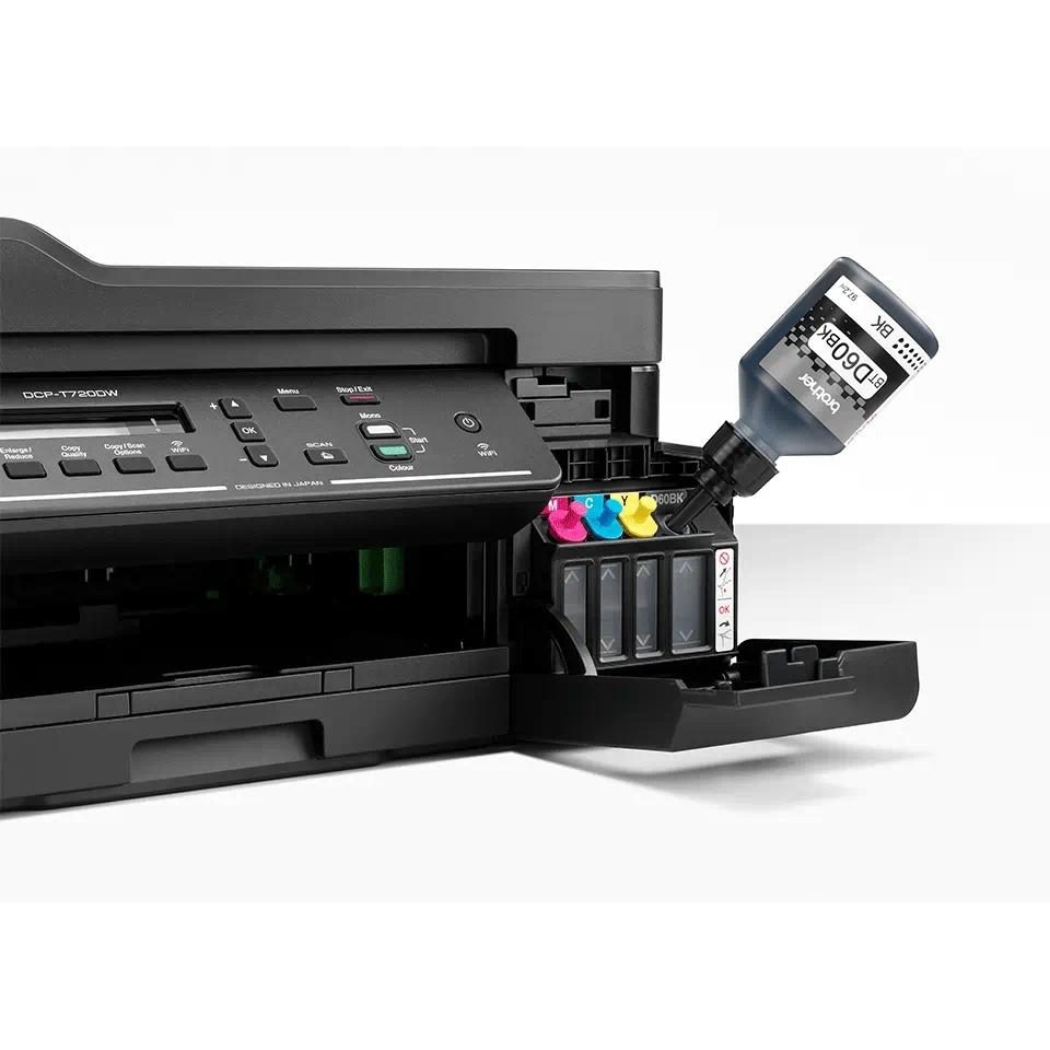 Компактно и елегантно, DCP-T720DW е мултифункционално безжично A4 мастилено-струйно устройство, създадено с мисъл за дома или малкия офис. Осигурявайки висококачествен печат, копиране и сканиране, DCP-T720DW ви позволява да спестявате средства при всяко отпечатване. Когато използвате DCP-T720DW, не е нужно да стоите да принтера, за да завършите задачите си. Освен високоскоростната USB връзка, той предлага и безжична мрежова връзка, така че можете да печатате в движение и дори от мобилно устройство. Заедно с DCP-T720DW ще получите 2 бутилки с черно мастило (капацитет до 7500 страници), 1 бутилка със синьо мастило (капацитет до 5000 страници), 1 бутилка с червено мастило (капацитет до 5000 страници) и 1 бутилка с жълто мастило (капацитет до 5000 страници). Това ще ви позволи да започнете работа възможно най-бързо, както и да се наслаждавате на изключително ниска цена на печат. DCP-T720DW предлага скорост на печат до 16.5ipm цветно и 17ipm черно-бяло, така че можете да отпечатвате множество документи бързо и лесно. Освен това можете да разчитате на висококачествени разпечатки с резолюция до 1200 x 6000 dpi. Принтерите от тази гама са издръжливи и снабдени с множество функции. В допълнение, новата система за презареждане никога не е била по-удобна. Резервоарът с голям капацитет вече може да се напълни с бутилки с мастило без да държите бутилката постоянно - просто поставете бутилката във отвора на съответния резервоар и когато бутилката е празна, премахнете я и се уверете, че резервоарът е затворен. Край на бъркотията.