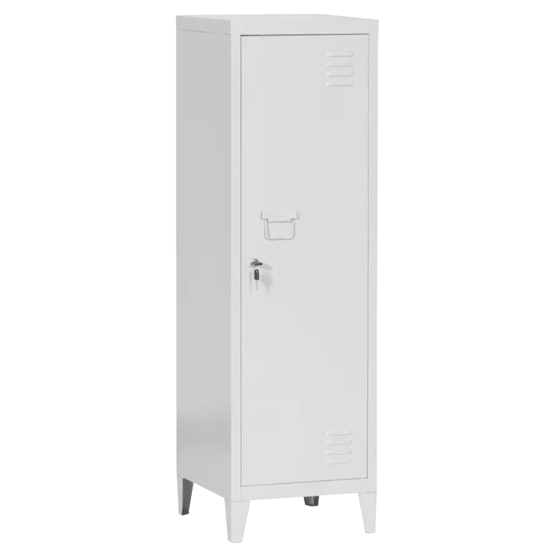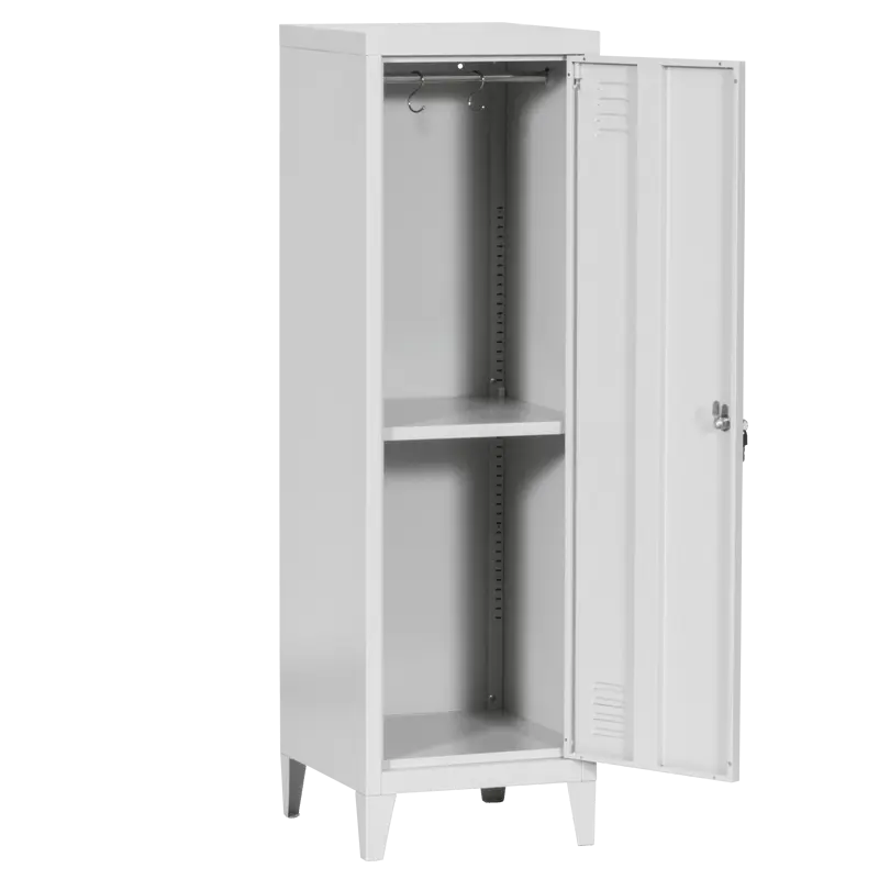 Металният гардероб BTL J с 2 отделения 128х39х42 см е единичен гардероб с един регулируем рафт и лост за закачалки. Вратата е със заключване и вентилационни отвори за приток на въздук. Може да бъде свободностоящ или да бъде монтиран към стена.