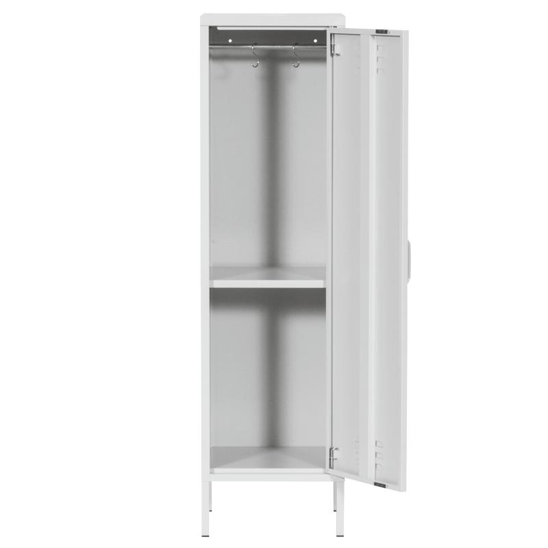 Металният гардероб BTL J с 2 отделения 138х38х38 см е единичен гардероб, който по желание може да бъде монтиран към стена. Снабден е с лост за закачалки и един регулируем рафт. Вратата е с магнитно затваряне и вентилационни отвори за приток на въздух.