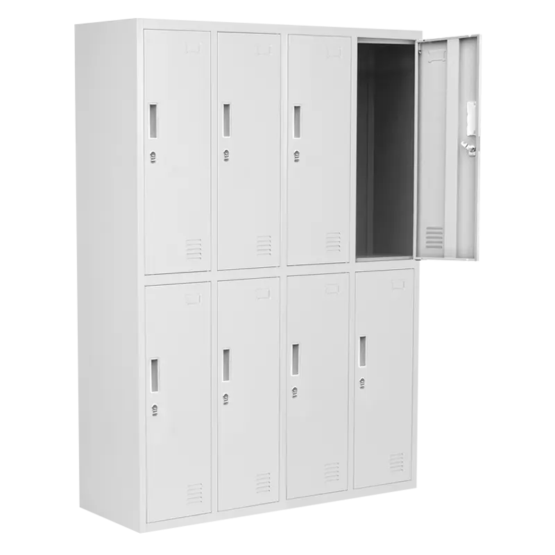 Металният гардероб BTL се състои от 8 отделения за съхранение на багаж. Моделът е изработен от прахово боядисан метал с гладко покритие. На вратите има вентилационен отвор и място за поставяне на етикет. Шкафчетата се затварят посредством заключващ механизъм с помощта на катинар. Катинарите не са включени в цената.
