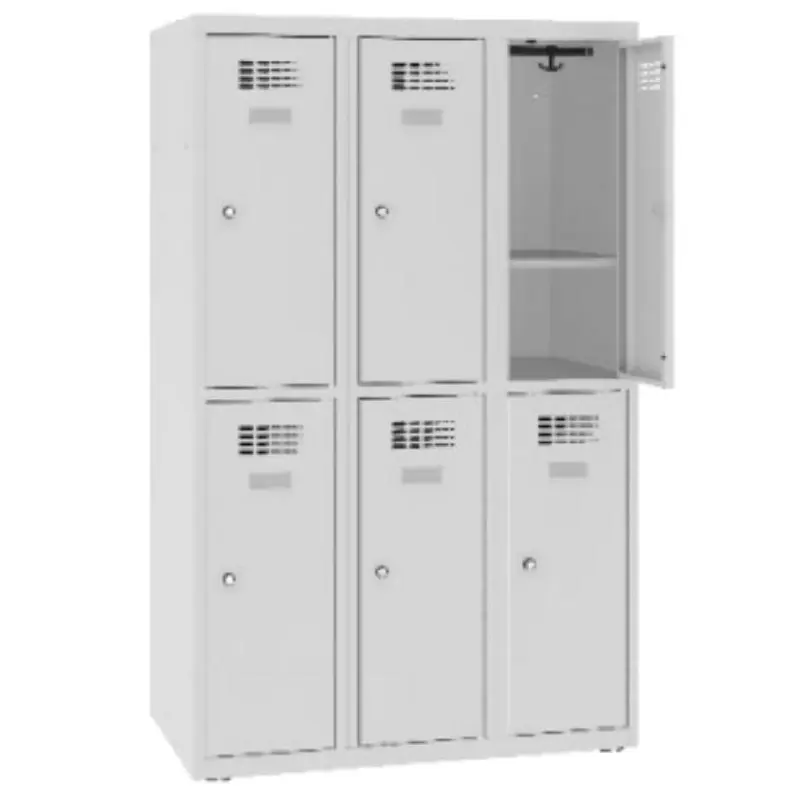 Три свързани колони с 2 отделения в колона, всяко със закачалка (PVC тръба с две двойни куки) и хоризонтален рафт. Прахово боядисана стоманена ламарина с дебелина 0.6 мм. Врати с вентилационни отвори, проектирани за вертикална вентилация. Самозалепваща се табелка, от външната част на вратичката.
