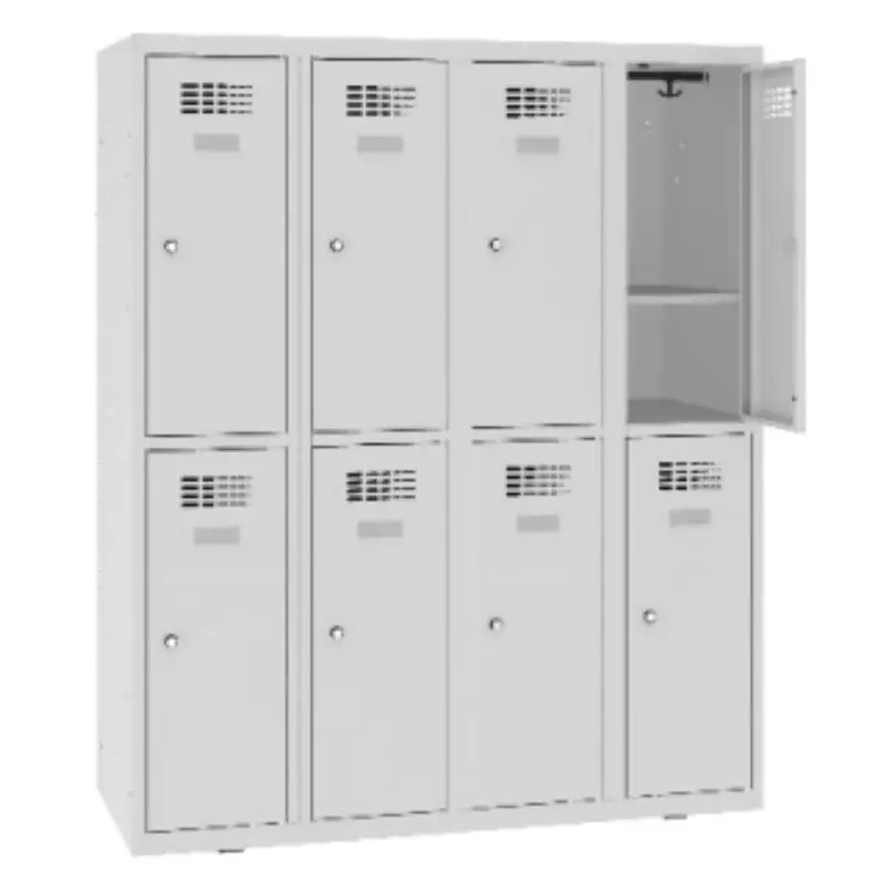 Четири свързани колони с 2 отделения в колона, всяко със закачалка (PVC тръба с две двойни куки) и хоризонтален рафт. Прахово боядисана стоманена ламарина с дебелина 0.6 мм. Врати с вентилационни отвори, проектирани за вертикална вентилация. Самозалепваща се табелка, от външната част на вратичката. Едноточково заключване с ключ (включени 2 ключа).