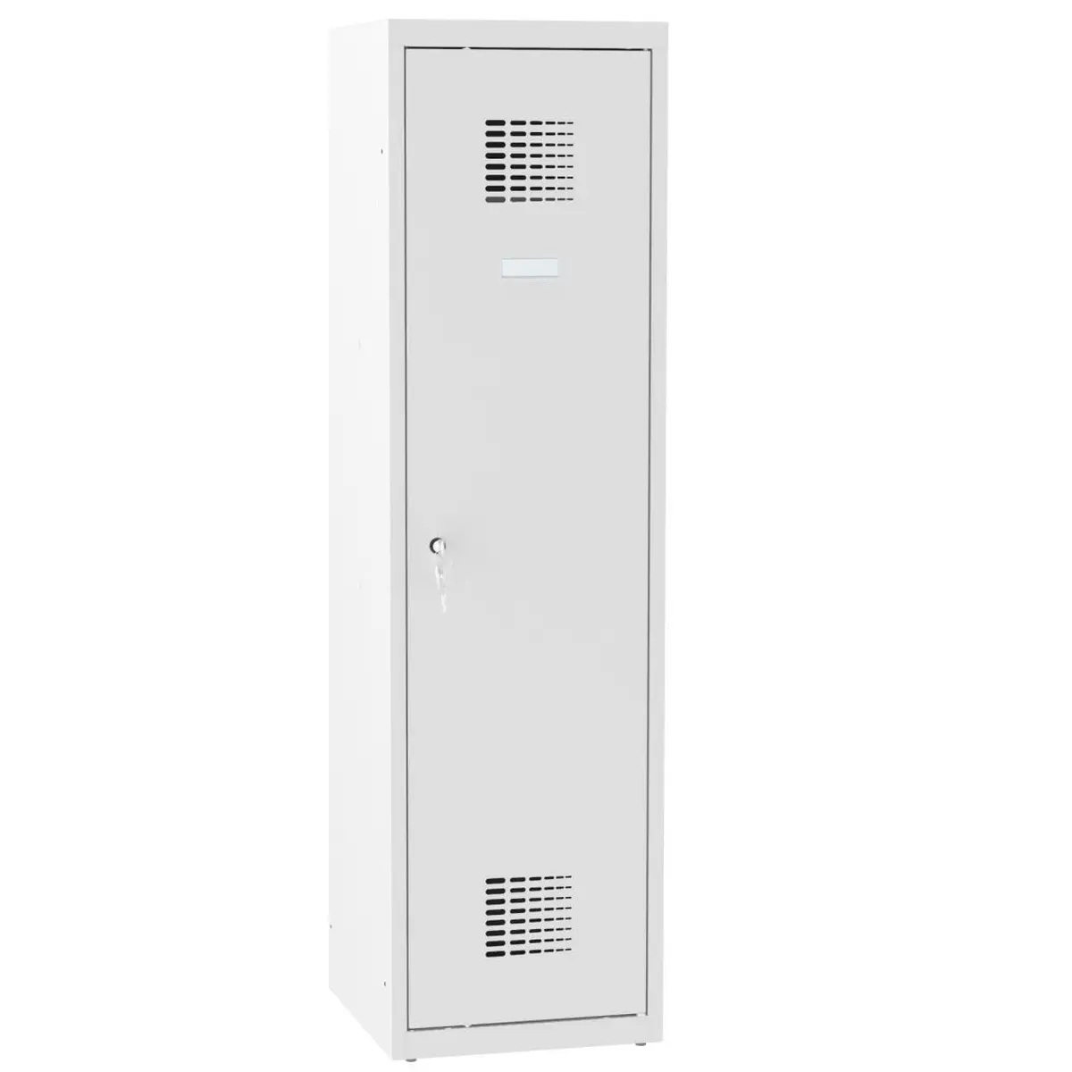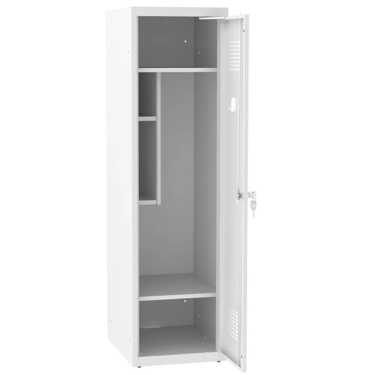 Металният гардероб FRT с 1 отделение е оборудван с 2 рафта за книги, рафт за обувки, кукички за дрехи, самозалепващи табелки за име, ограничител за отварянена вратата до 90 градуса и индивидуално заключване.