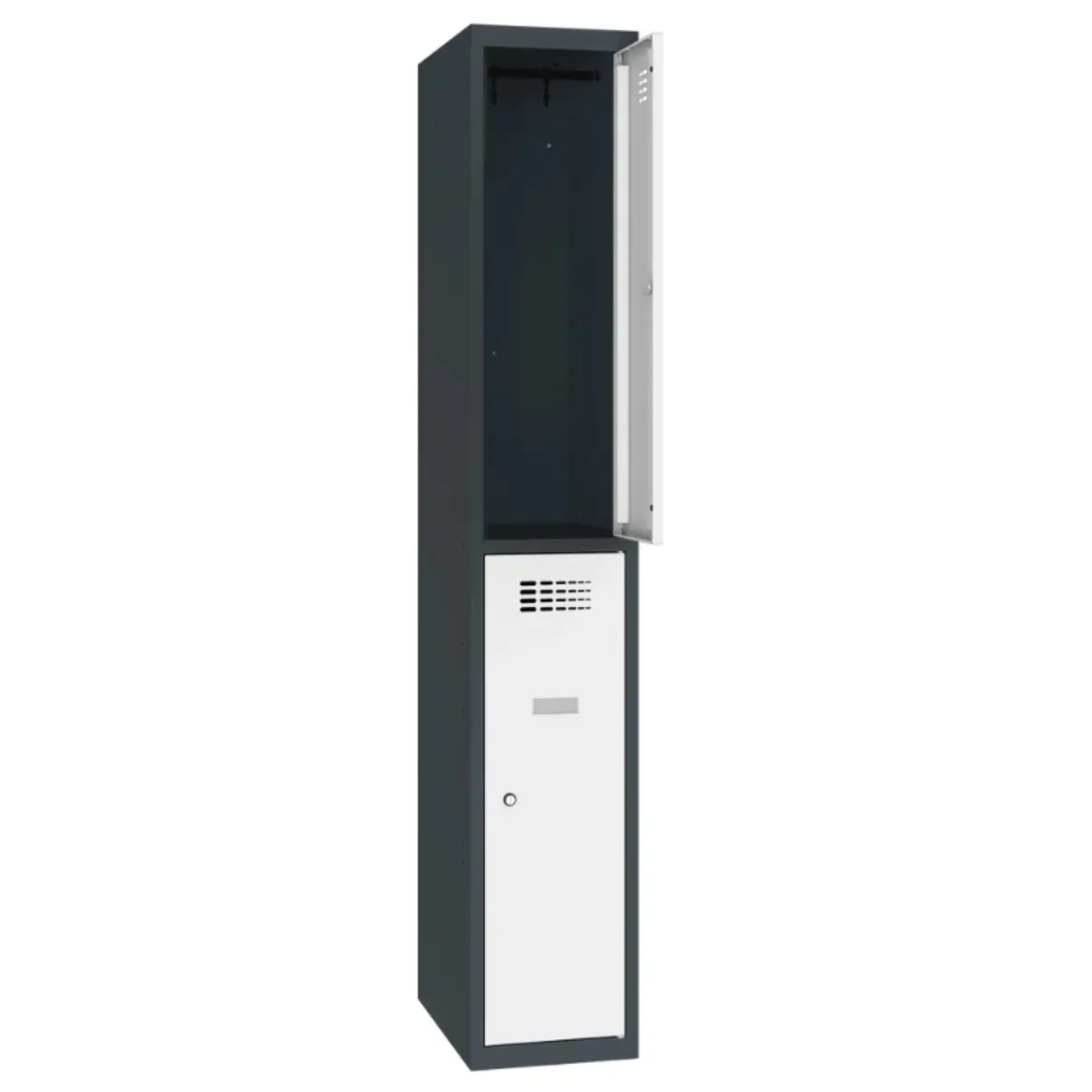 Металният гардероб FRT 180х30х50 см разполага с две самостоятелно обособени чрез надеждно заключване части. Гардеробът е практичен и предоставя необходимото пространство за съхранение на дрехи, обувки и лични принадлежности.