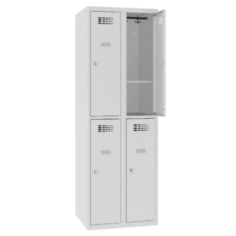 Две свързани колони с 2 отделения в колона, всяко със закачалка (PVC тръба с две двойни куки) и хоризонтален рафт. Прахово боядисана стоманена ламарина с дебелина 0.5 мм. Врати с вентилационни отвори, проектирани за вертикална вентилация. Самозалепваща се табелка, от външната част на вратичката.