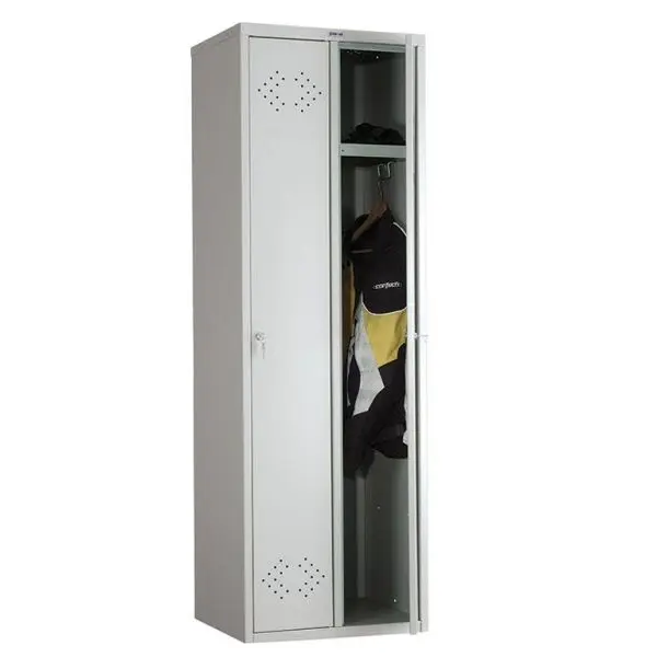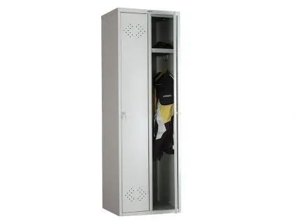 Двойният метален гардероб PMT с 2 отделения има изключително интересен дизайн по отношение на отворите за вентилация, които са оформени във формата на стрелки. Посредством гардеробът ще можете да оползотворите както свободното пространство, така и същевременно ще разнообразите неговия облик.