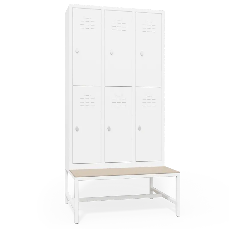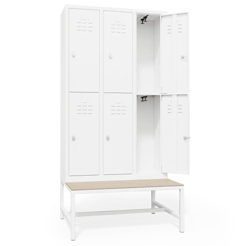 Металният гардероб разполага с шест метални врати, шест рафта, възможност за заключване, вентилационен отвор и 12 кукички за закачане на багаж. Той е изключително подходящ за спортни и детски зали, както и фитнес центрове.