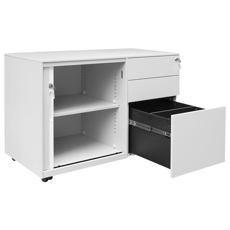 Металният контейнер разполага с 2 чекмеджета и отделение с плъзгаща врата, като всяка зона е снабдена с отделно заключване с ключ. Вътрешният шкаф е оборудван с регулируеми рафтове, осигуряващи адаптивно пространство за документи и консумативи. Плъзгащата врата улеснява достъпа в тесни пространства, а компактният дизайн е подходящ за поставяне под или до бюро.