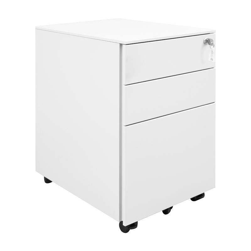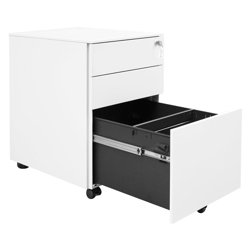 Металният контейнер разполага с 3 чекмеджета, включително долно чекмедже с водачи за висящи папки, и е снабден с централно заключване с ключ за сигурност. Благодарение на компактния си размер и колелца, е изключително удобен за позициониране под или до бюро. Горните чекмеджета са подходящи за офис принадлежности, а долното за документи и папки.