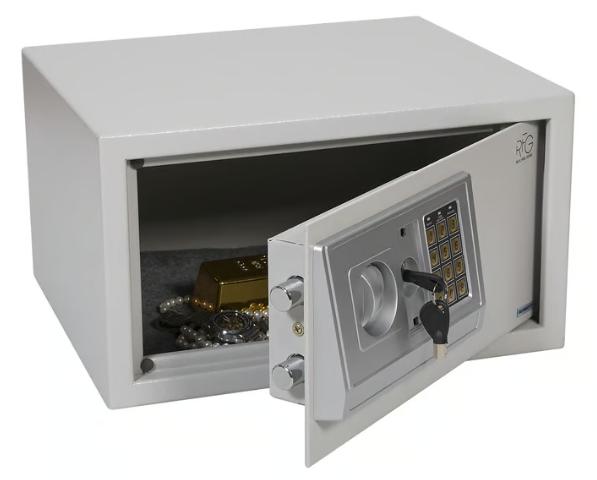 Метален сейф UG 23 EL за съхранение на документи, предмети и ценности. Подходящ за дома, офиса, хотели и магазини. Заключването е посредством електронен код. Бравата е с надеждно двуточково заключване.
