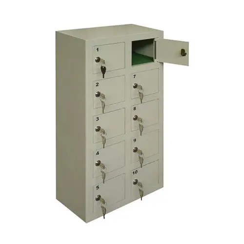 Металният шкаф FRT за лаптоп 78х39х20 см е подходящ за съхранение на лаптопи, мобилни телефони и лични принадлежности. Притежава 10 самостоятелни отделения.