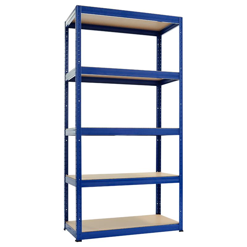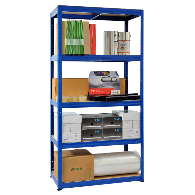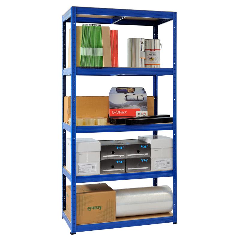 Стабилният стелаж с размери 180х90х40 см е изработен от праховобоядисан метал в син цвят. Той има 5 МДФ рафта всеки, от които издържа на максимално натоварване до цели 175 кг. Стелажът се сглобява бързо и лесно чрез безболтов монтаж, а височината на рафтовете може да бъде регулирана според вашите нужди. Подходящ е за архивиране на документи и в складове.