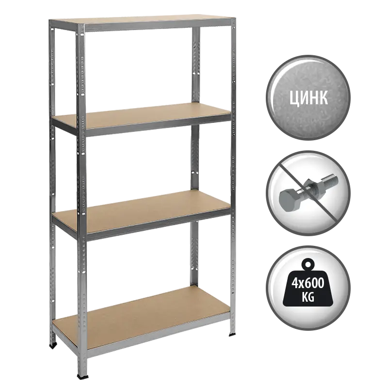 Метален стелаж BTL цинк е стабилен стелаж от галванизиран метал с размери 180x90x40 см. С негова помощ ще подредите килера или гаража у дома, както и работното си пространство. Разполага с 4 МДФ рафта, всеки от които може да издържа на максимално натоварване от 600 кг. Благодарение на безболтовия монтаж височината на рафтовете може да бъде лесно регулирана и променяна.
