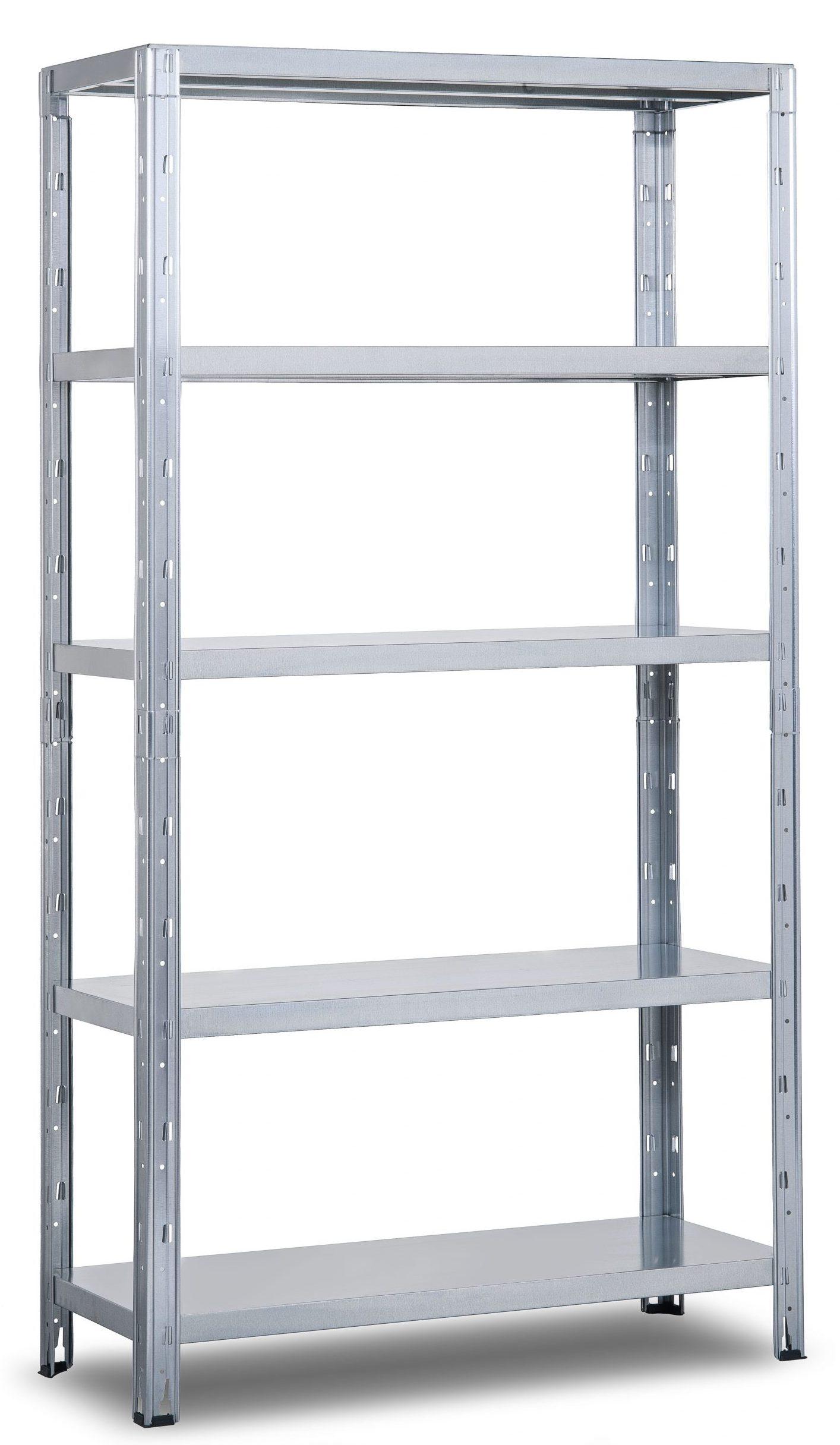 Стабилният стелаж с размери 188x100х40 см е изработен от поцинкован метал. Той има 5 рафта всеки, от които издържа на максимално натоварване до 65 кг. Стелажът се сглобява бързо и лесно, а височината на рафтовете може да бъде регулирана според вашите нужди.