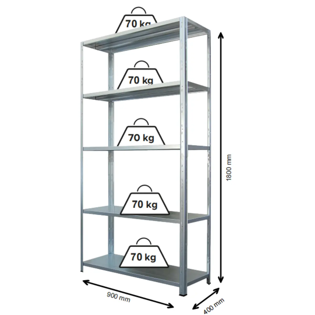 Стабилният стелаж с размери 180х90х40 см е изработен от поцинкован метал. Той има 5 рафта всеки, от които издържа на максимално натоварване до 70 кг. Стелажът се сглобява бързо и лесно, а височината на рафтовете може да бъде регулирана според вашите нужди.
