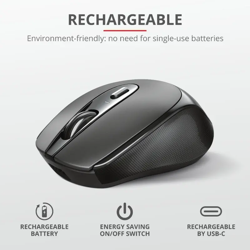 | Интерфейс | Wireless with USB micro-receiver (10m Wireless range), storable inside the mouse; USB-C port to recharge the battery (USB-A cable included) |