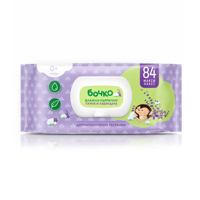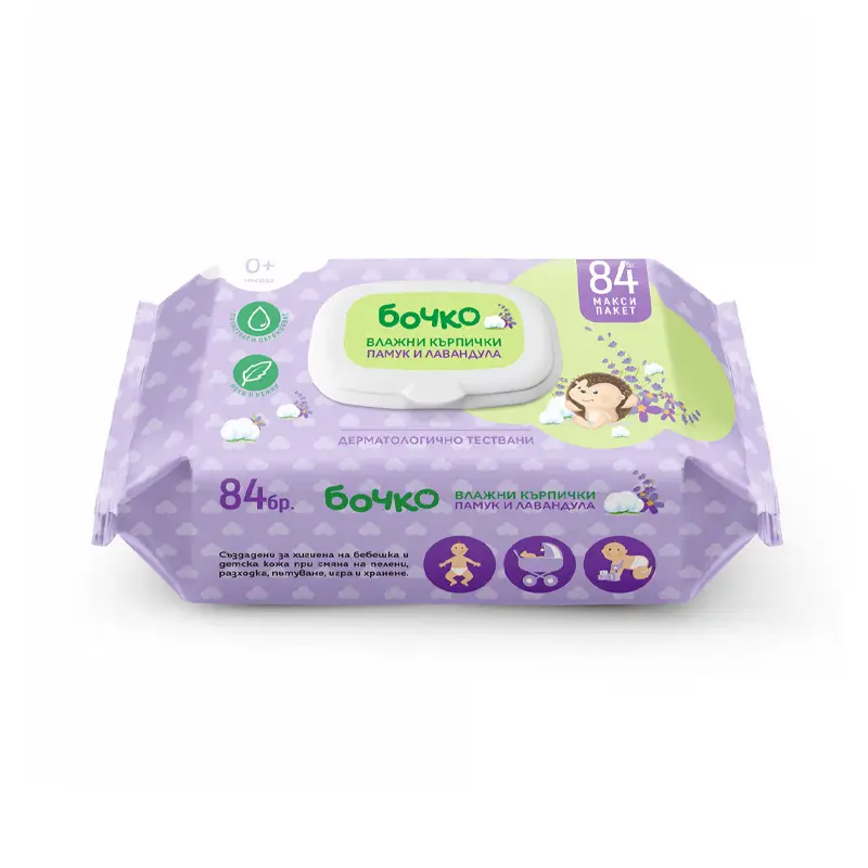 Влажните кърпички Бочко са предназначени за хигиена на бебешка и детска кожа. Идеални при смяна на пелените, при разходка, по време на пътуване, игри и хранене. Подходящи за честа употреба. Напоени с мек лосион на водна основа, с деликатен аромат и с балансирано рН. Без спирт, оцветители и други дразнещи съставки. С включени ценни растителни екстракти. Екстрактът от памук подхранва и омекотява, а екстрактът от лавандула действа антисептично и успокояващо. Лосионът на влажните кърпички Бочко съдържа още растителен глицерин, витамин Е и пантенол – за защита, възстановяване и грижа за влажността на деликатната бебешка кожа. Изработени от мек текстил с добавен релеф за по-лесно почистване и нежен допир по време на използване.