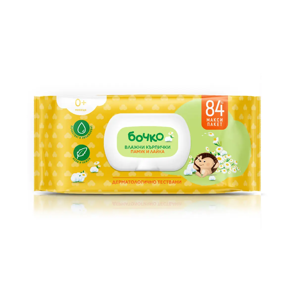 Почистват, овлажняват и защитават чувствителната кожа на бебето от първия ден. Нежният лосион на водна основа е с подбрани съставки и деликатен аромат. Екстрактът от памук подхранва и омекотява, а екстрактът от лайка има успокояващо и антисептично действие. Добавените растителен глицерин, витамин Е и пантенол действат овлажняващо. С балансирано рН. Без спирт, оцветители и други дразнещи съставки. Кърпичките Бочко са подходящи за честа употреба. Мекият релефен текстил осигурява лесно почистване и нежен допир по време на използване.