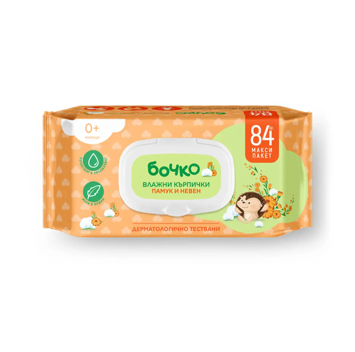 Бебешките влажни кърпички Бочко са създадени за почистване и защита на бебешката кожа от първия ден. Подходящи за честа употреба. Напоени с мек лосион на водна основа, с деликатен аромат и с балансирано рН. Без спирт, оцветители и други дразнещи съставки. С включени ценни растителни екстракти. Екстрактът от памук подхранва и омекотява, а екстрактът от невен действа антимикробно и възстановяващо. Лосионът на влажните кърпички Бочко съдържа още растителен глицерин, витамин Е и пантенол – за защита, възстановяване и грижа за влажността на деликатната бебешка кожа. Изработени от мек текстил с добавен релеф за по-лесно почистване и нежен допир по време на използване.