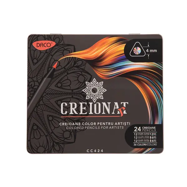 Комплект с 12 двустранно подострени и 12 едностранни цветни молива за рисуване и оцветяване. Металната кутия включва общо 60 цвята, от които 12 броя са пастел и 24 броя неон двуцветни с подарък метална острилка.