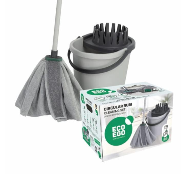 Комплектът за почистване е практично решение за ефективно почистване. Включва кофа с вградена цедка и моп с телескопична дръжка, който улеснява достигането на труднодостъпни места. Компактният дизайн и леката конструкция правят комплекта удобен за ежедневна употреба у дома.