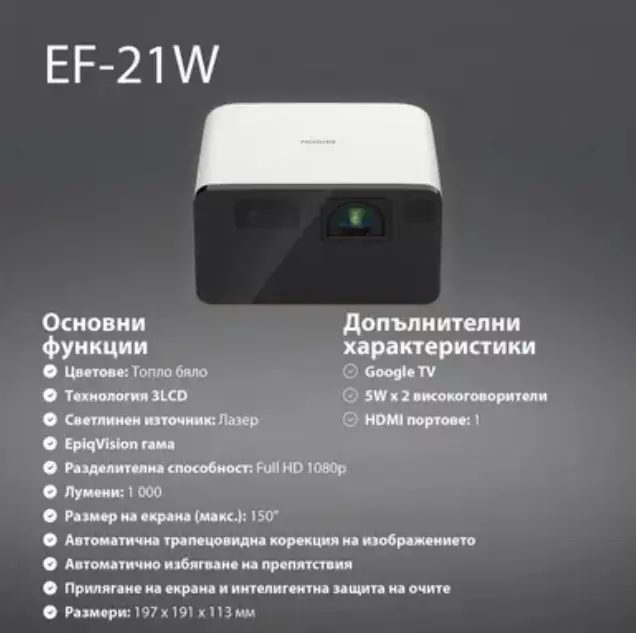 | Други | Google TV, Automatic keystone correction, Built-in speaker, Chromecast, Google search, Horizontal and vertical keystone correction, Instant on/off, Quick Corner; 2D Colour Modes: Dynamic, Natural, Cinema, Vivid |
