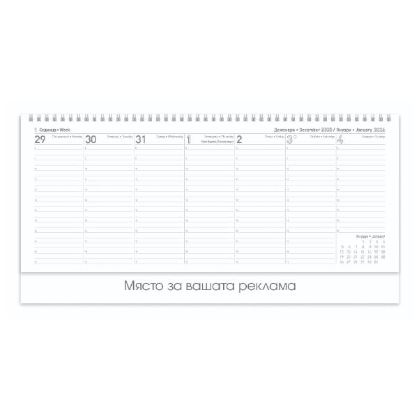 Настолен календар НК 7 е практичен и стилен инструмент за организация на времето и планиране на ежедневните задачи. Календарът е с корица от висококачествен финландски опаковъчен картон с плътност 300 г/м², подходяща за дигитален и офсетов печат, което позволява лесно персонализиране с фирмено лого или послание.