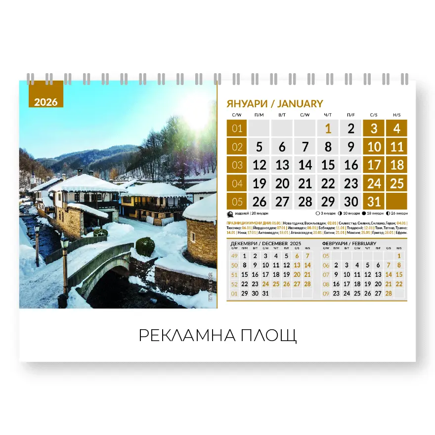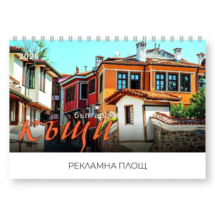 Настолен календар пирамидка Български къщи с готов дизайн, представящ красиви български възрожденски къщи и архитектурни шедьоври от различни региони на България. Този календар съчетава практичност и национален дух, превръщайки се в чудесен акцент за всяко бюро.