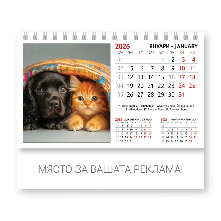 Настолен календар пирамидка любимци e oчарователен настолен календар пирамидка с готов дизайн, който представя любимци – кучета, котки и други домашни животни, създавайки настроение и уют на работното място.