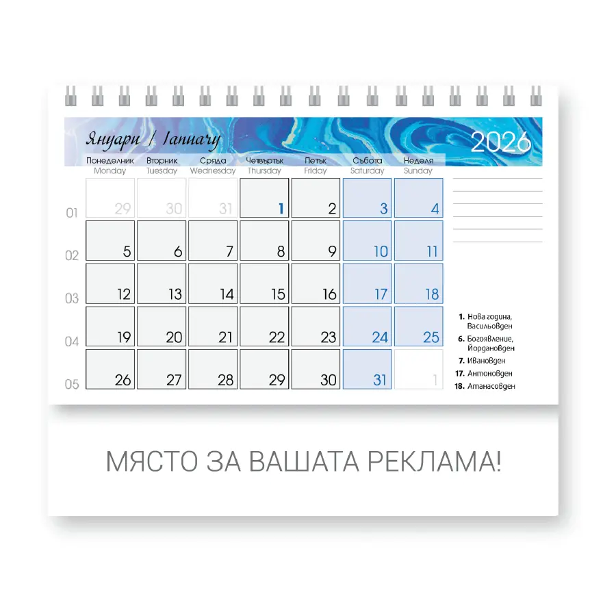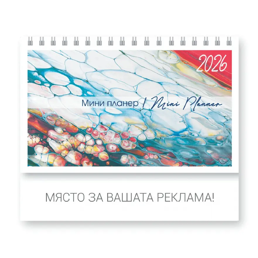 Настолен календар пирамидка Мини планер с готов дизайн е компактно и стилно решение за планиране на ежедневните задачи. Календариумът е на два езика – български и английски, като позволява лесен преглед на месечните и седмичните дейности.