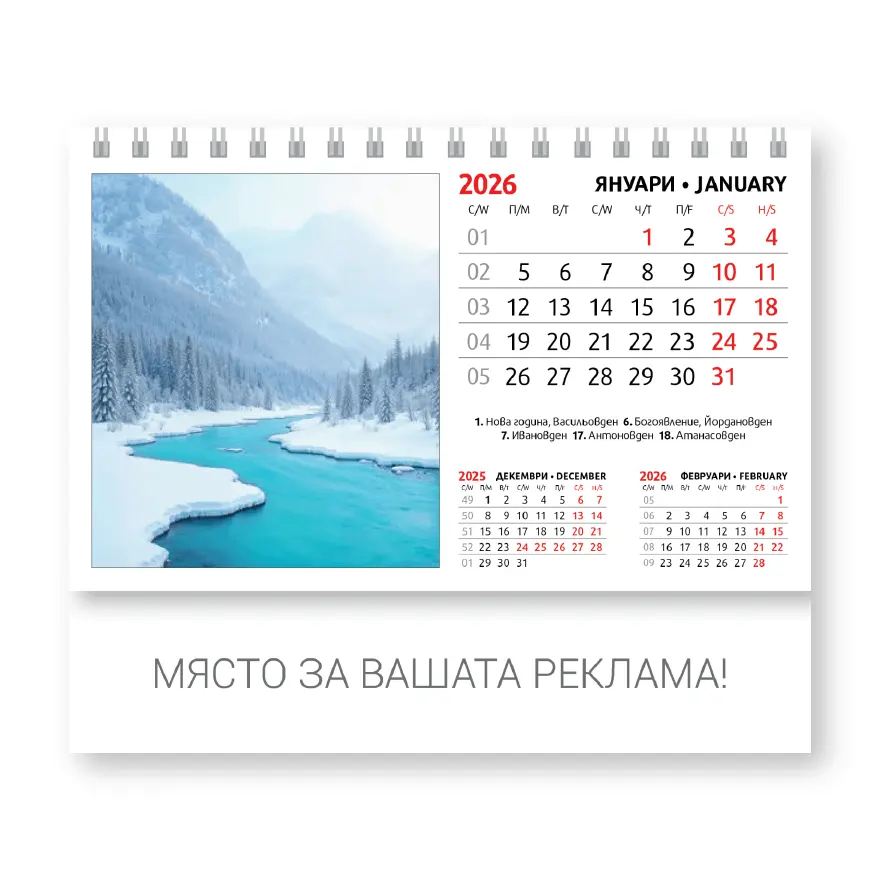 Настолен календар пирамидка планини с готов дизайн, който представя красиви планински пейзажи, вдъхновяващи спокойствие и природна красота. Идеален за офиса, бюрото или домашната маса, този календар съчетава практичност, стил и висококачествени материали.