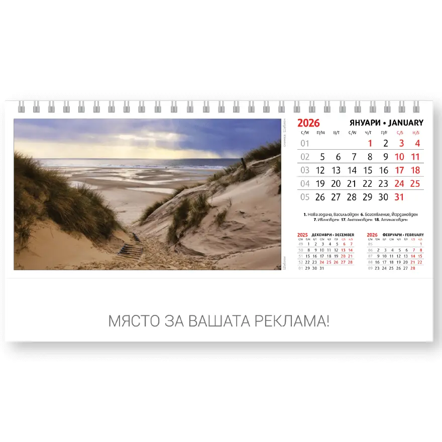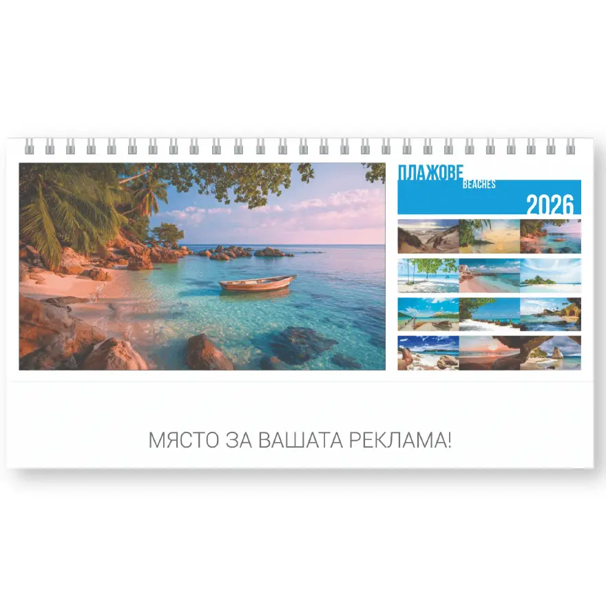 Настолен календар пирамидка плажове е стилен настолен календар пирамидка с готов дизайн, посветен на красотата на морето и плажовете по света. Всеки месец представя различен слънчев морски пейзаж, който внася настроение, спокойствие и усещане за лято през цялата година.