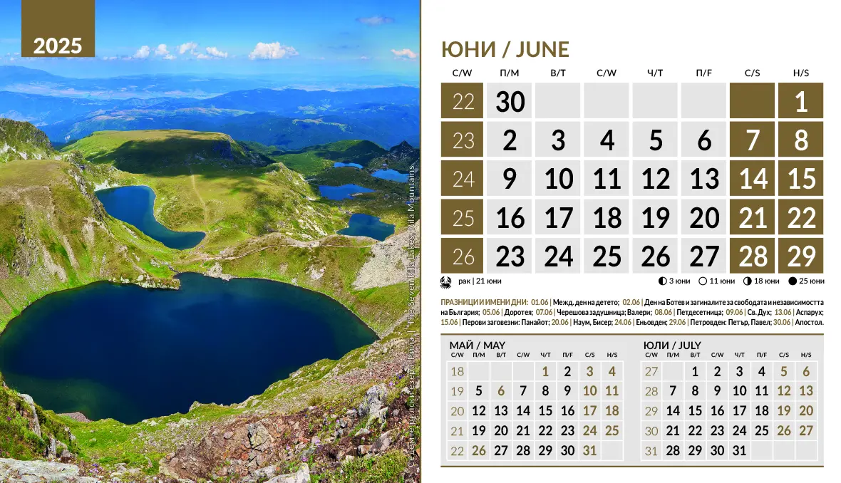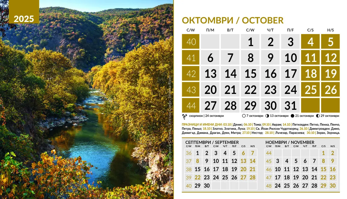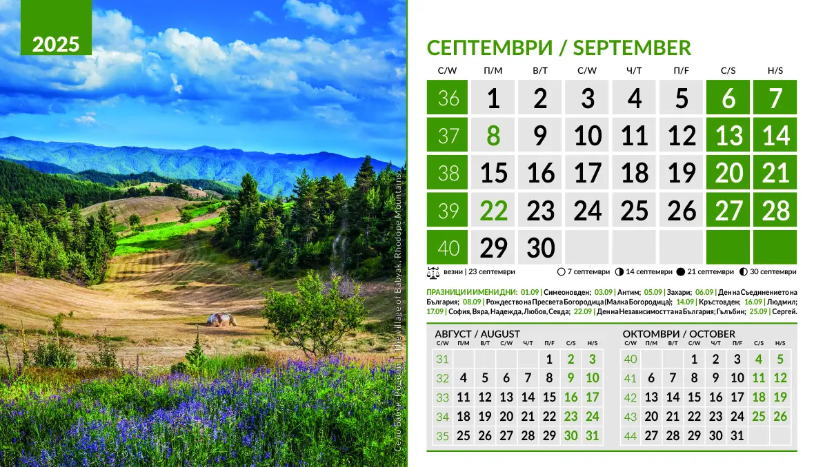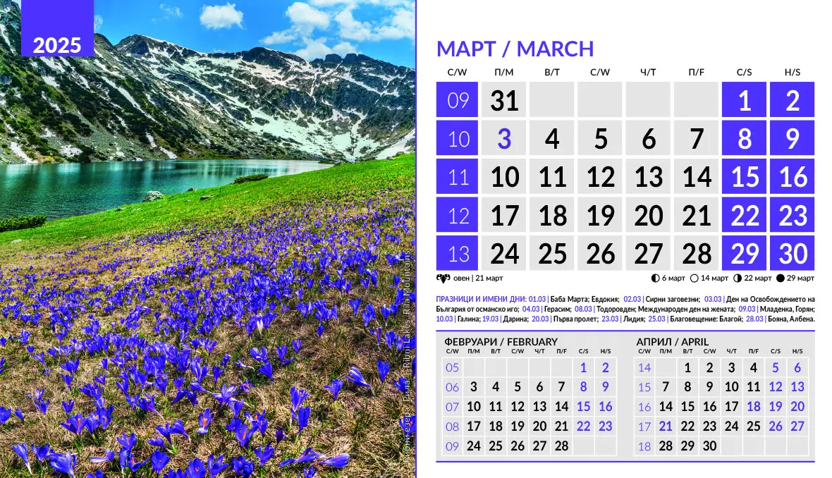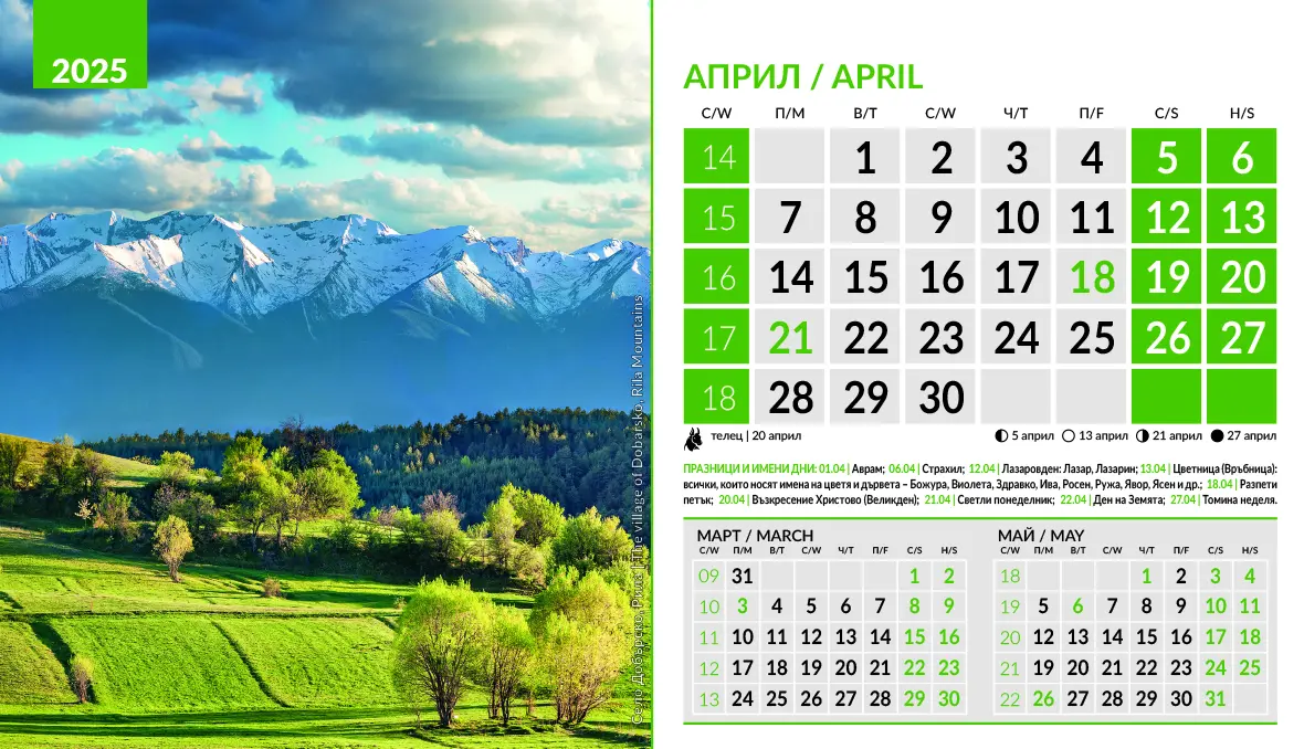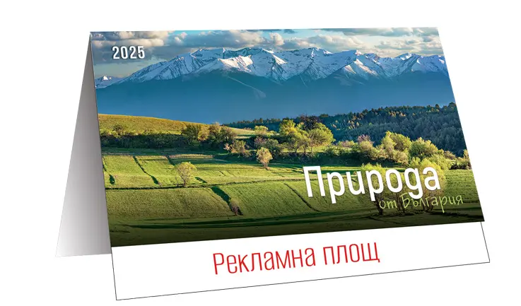 Настолен календар пирамидка Природа с готов дизайн, вдъхновен от красотата на природата. Всеки месец представя различен природен пейзаж – гори, езера, планини и цветни поля, които носят спокойствие и хармония в ежедневието.