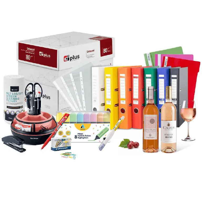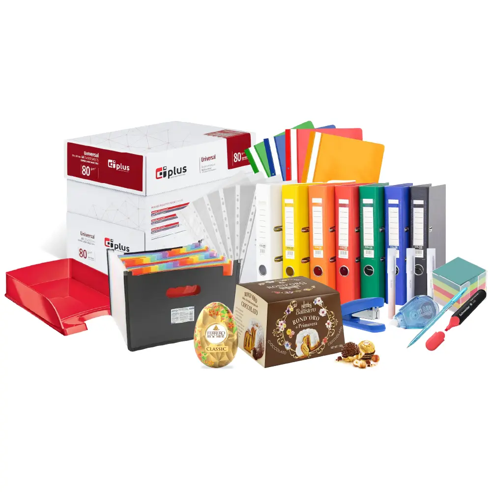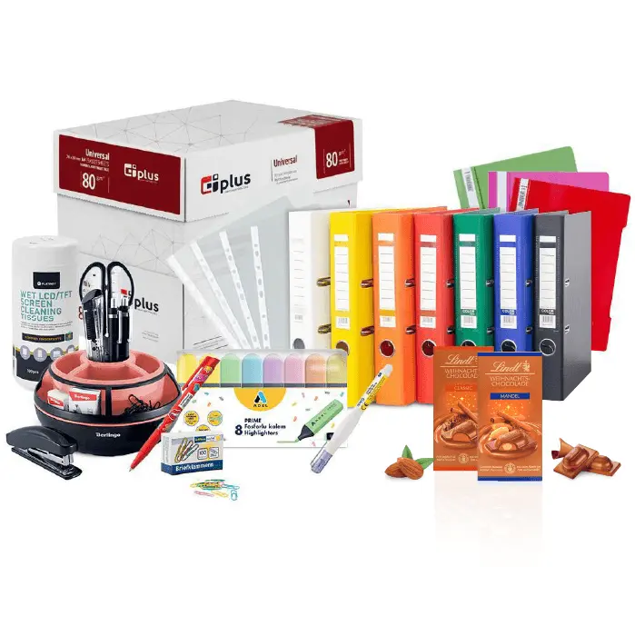 Само сега може да се възползвате от неустоимото ни предложение за канцеларски материали. Със закупуването на офис комплекта с подарък вие ще получите копирна хартия, класьори, PVC папки, джобове за документи, кламери, химикалки, текст маркери, коректор, цветно кубче, органайзер за бюро и кърпички за почистване на монитори. В допълнение ще Ви дадем подарък кутия мини пралини Lindt 20 броя бонбони 100 г.