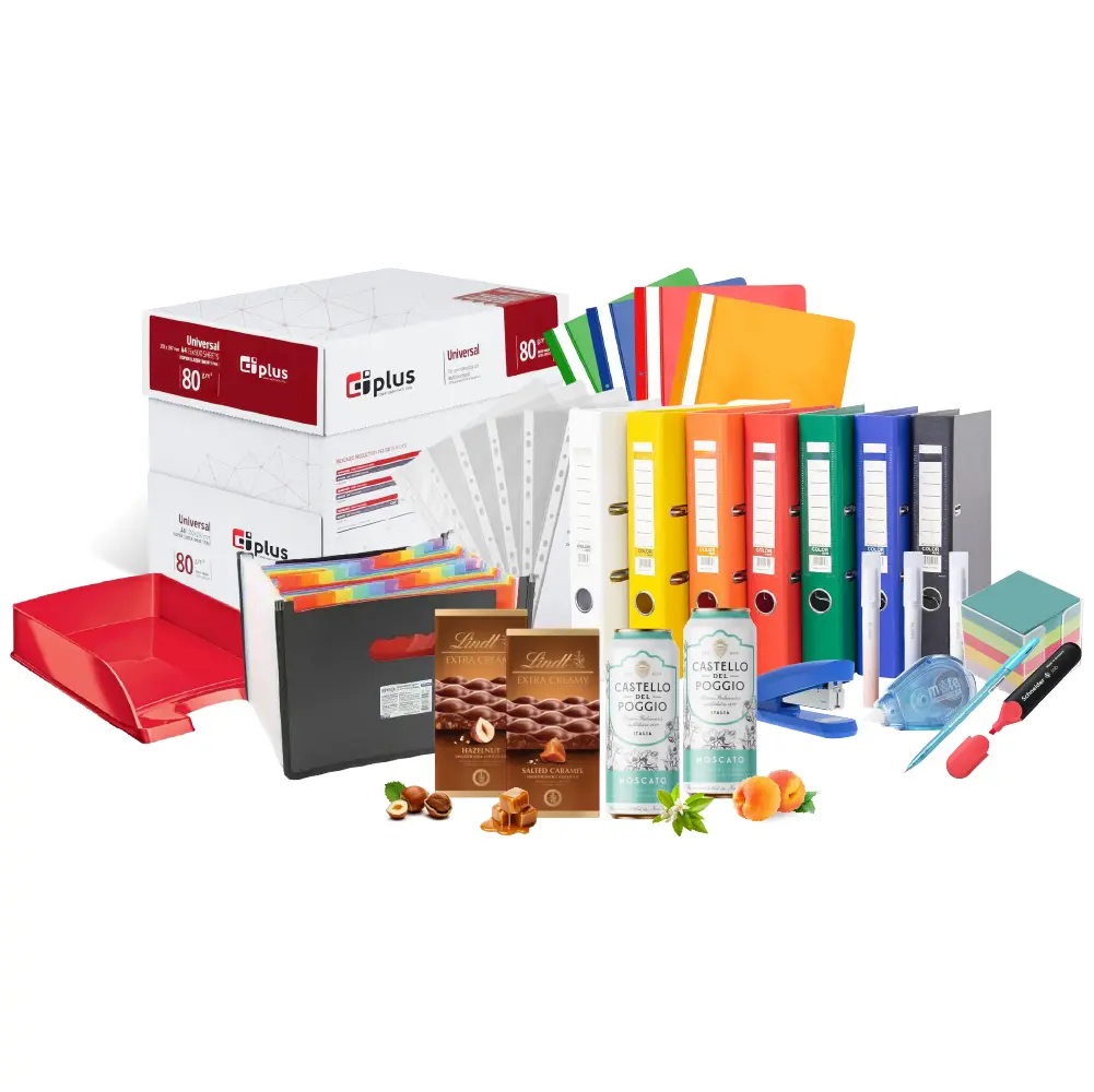 Само сега може да се възползвате от неустоимото ни предложение за канцеларски материали. Със закупуването на офис комплекта с подарък вие ще получите копирна хартия, класьори, PVC папки, джобове за документи, кламери, химикалки, текст маркери, коректор, цветно кубче, органайзер за бюро и кърпички за почистване на монитори. В допълнение ще Ви дадем подарък 2 кенчета бяло пенливо вино и 1 шоколад Lindt Extra Creamy с избор от три вкуса.