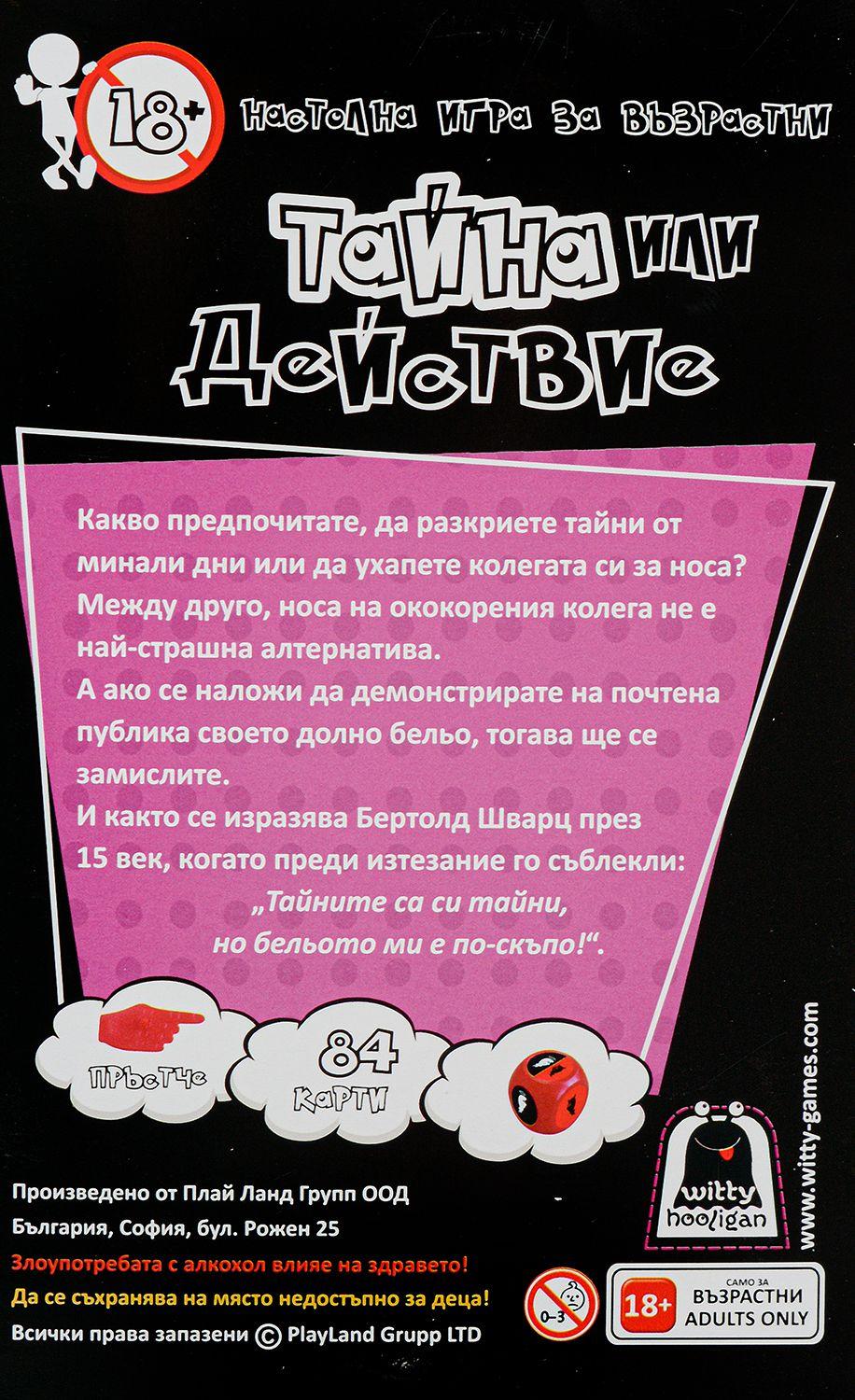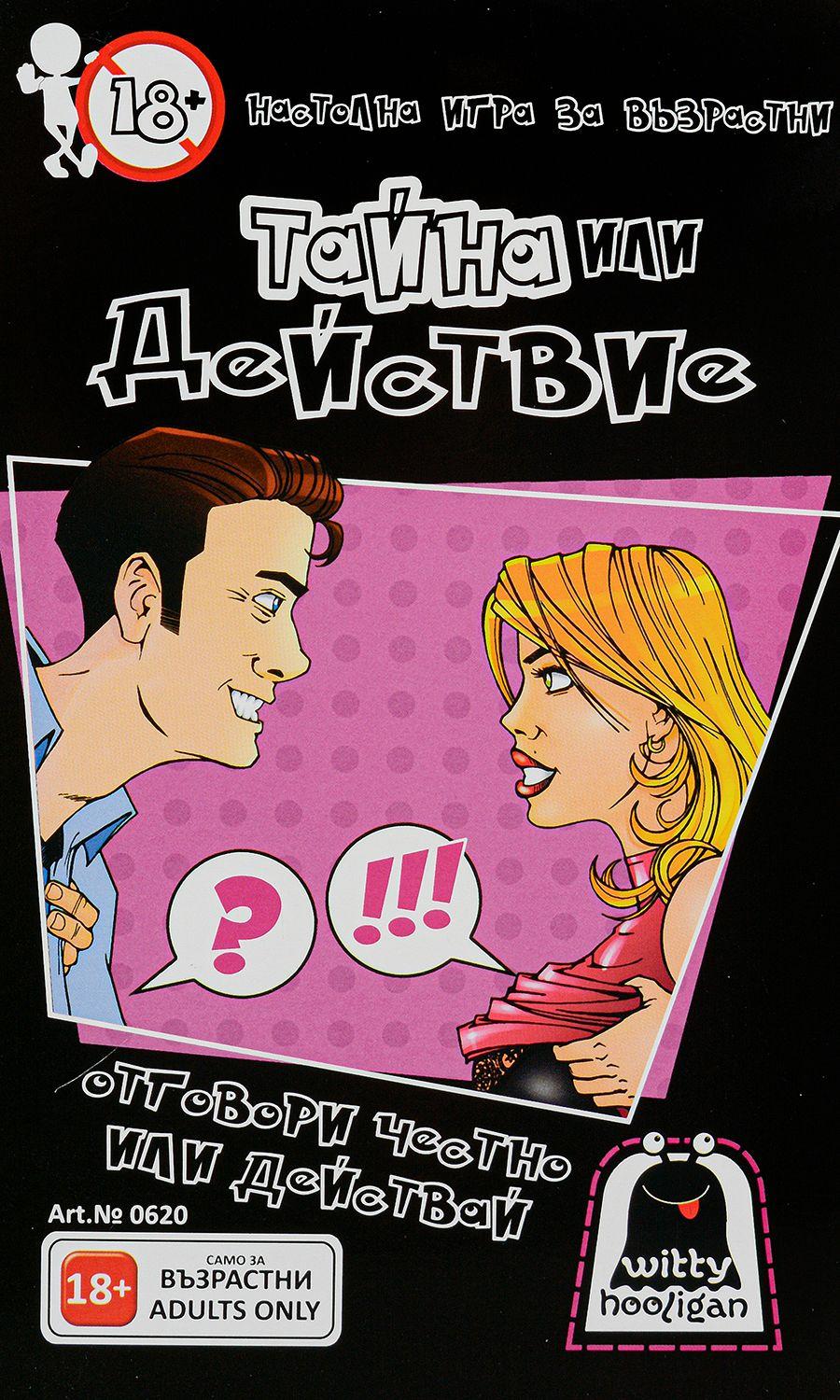 Тайна или Действие е игра за възрастни над 18 години от серията Witty Hooligan. В нея ще трябва или да споделите тайните си, или да извършите някое от действията на картите.