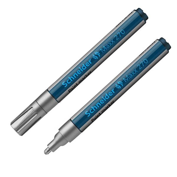 Перманентният лаков маркер Schneider Maxx 270 сребро е подходящ за писане върху картон, хартия, пластмаса, стъкло, метал и други. Устойчив е на топлина, абразиви и измиване.