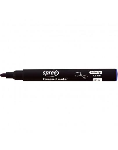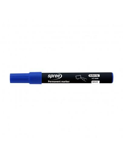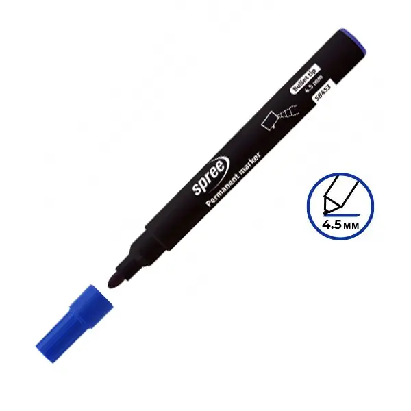 Синият перманентен маркер Spree е подходящ за писане върху различни повърхности като хартия, картон, пластмаса, стъкло и метал. Подходящ е за употреба в офиса, училище или у дома. Мастилото е перманентно, бързосъхнещо и водоустойчиво, което осигурява дълготрайни и ясни надписи.